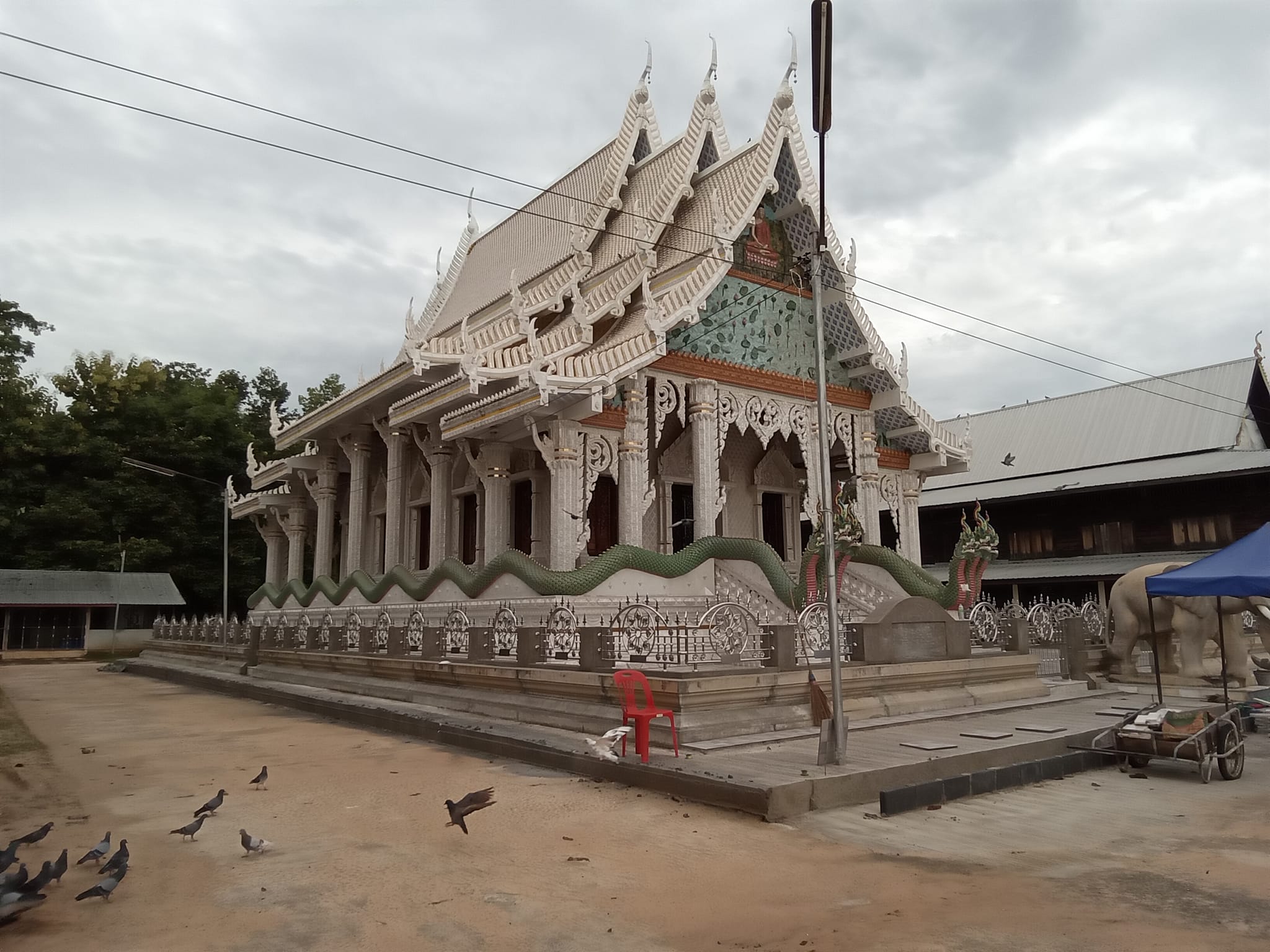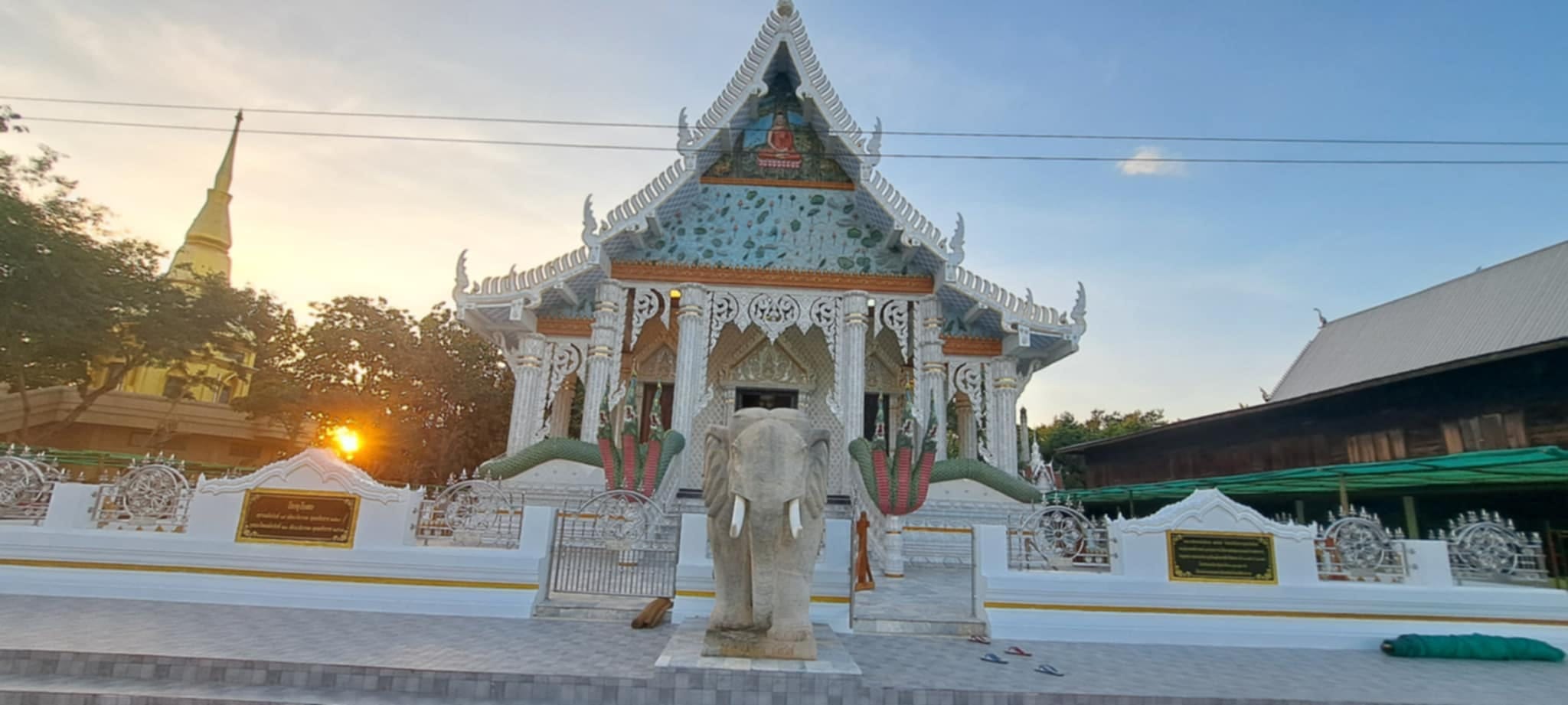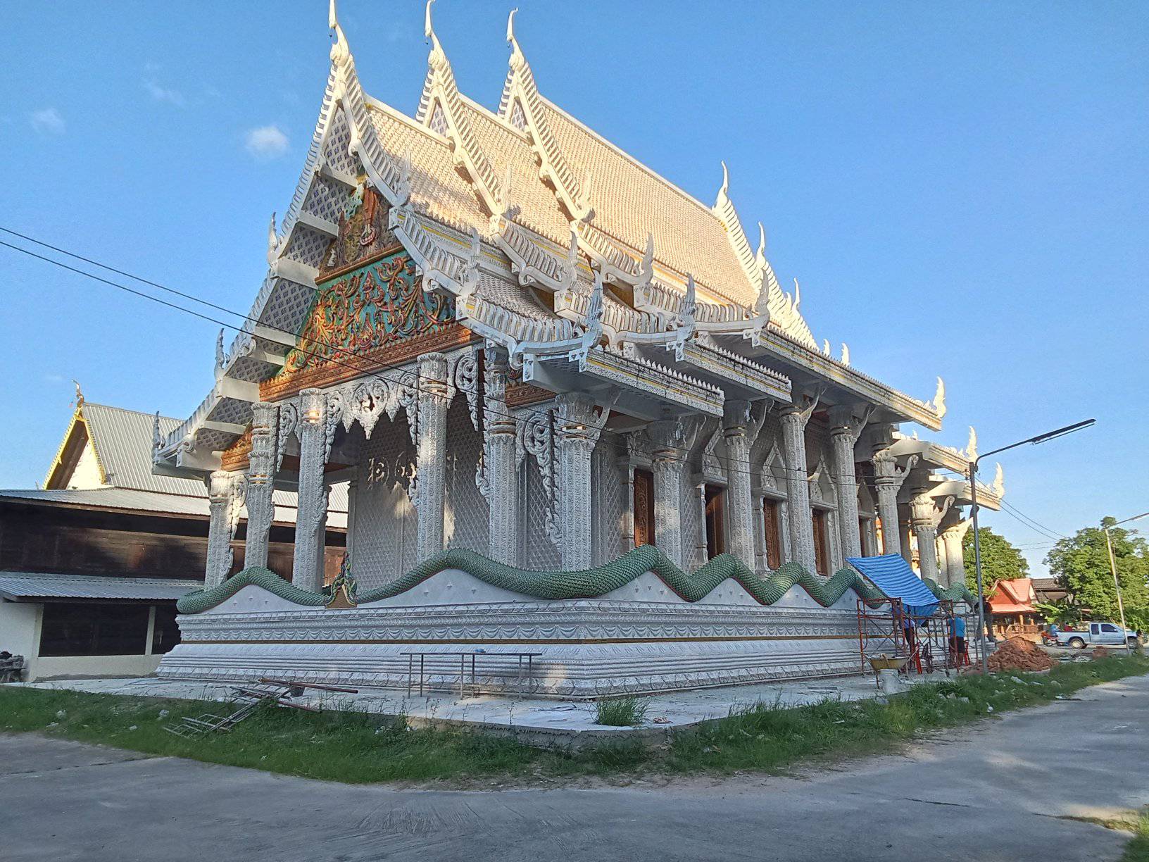 - พระอุโบสถ: จากภาพจะเห็นพระอุโบสถที่มีสถาปัตยกรรมงดงามโดดเด่น มีการตกแต่งด้วยลวดลายปูนปั้นประดับกระเบื้องอย่างประณีตวิจิตรตระการตา โดยเฉพาะบริเวณหน้าบันและซุ้มประตูหน้าต่าง หลังคาทรงไทยซ้อนชั้นลดหลั่นกันอย่างสวยงาม ด้านหน้ามีพญานาคคู่เลื้อยเป็นบันไดทางขึ้น เป็นศิลปะร่วมสมัยที่สะท้อนถึงแรงศรัทธาของชาวบ้าน